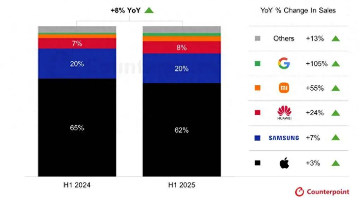CounterPointResearch报告显示,2025年上半年,全球售价超600美元的高端智能手机市场,苹果的销量虽然稳居第一,但份额有所下滑,较去年同期的65%下降到了62%。