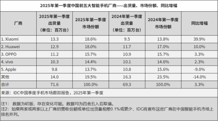 纵观中国市场,2025第一季度,苹果国内出货量滑落至980万台,市场份额仅13.7%,同比下降10%,成为前五大品牌中唯一负增长的厂商;排在苹果前的四名选手:小米、华为、OPPO、vivo,均保持正增长。