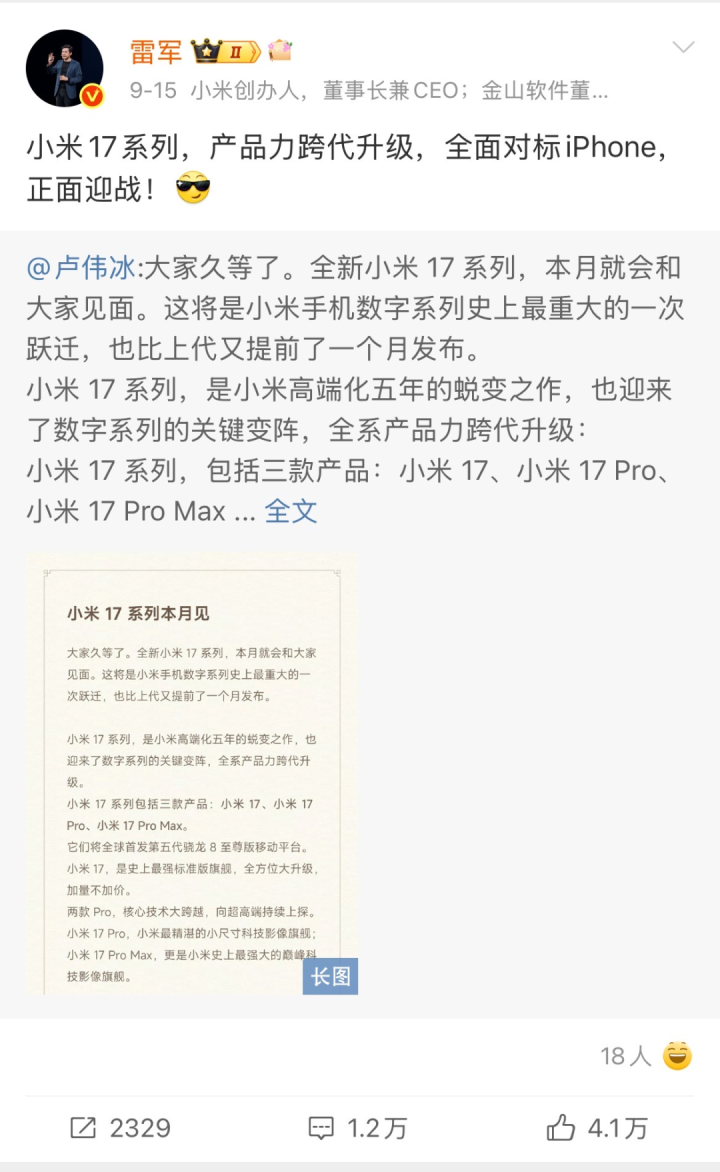 9月15日,雷军转发了卢伟冰的博文,放出狠话:小米17系列产品力跨代升级,全面对标iPhone,正面迎战!