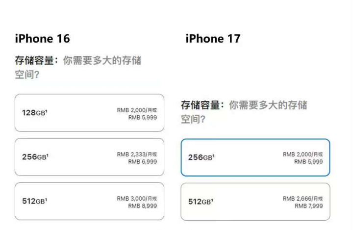 没想到,iPhone17系列牙膏挤爆了——最低配版本升级至256GB,相比上一代同存储版本还便宜了1000元,加量不加价。